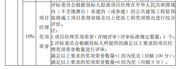 详细评审中项目经理荣誉评标委员会根据投标人拟派项目经理在中华人民共和国境内(不含港澳台)承建的(或参建)的公共建筑工程装饰装修施工项目获得省级及以上优质工程奖项情况进行综合评价。