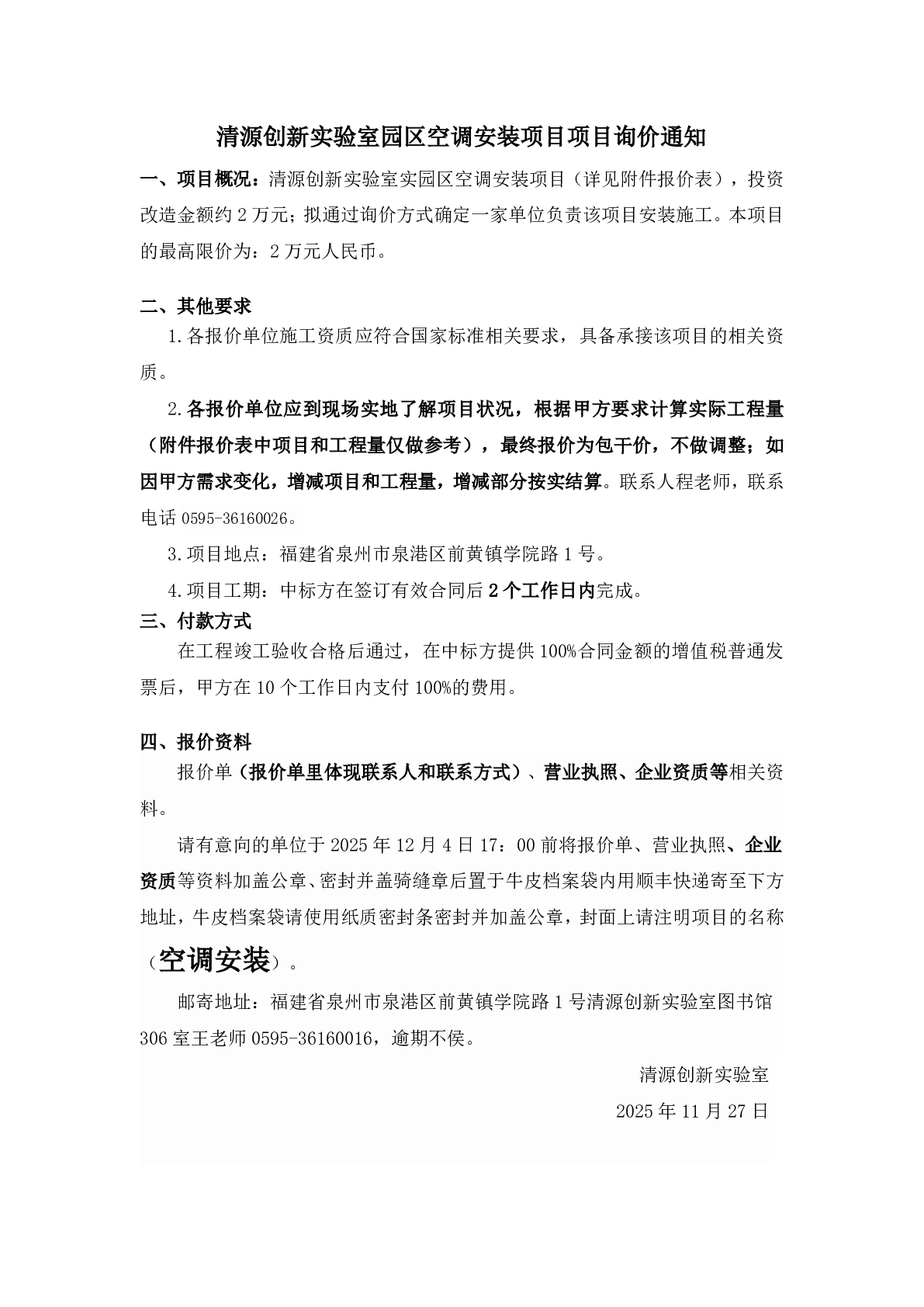 清源创新实验室实验楼园区空调安装项目项目询价通知